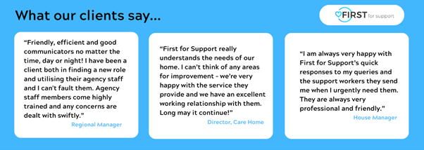 First for Support is a specialist social care recruitment and staffing company, delivering high-quality, person-centred support for children and adults nationwide, for a wide range of care environments including: