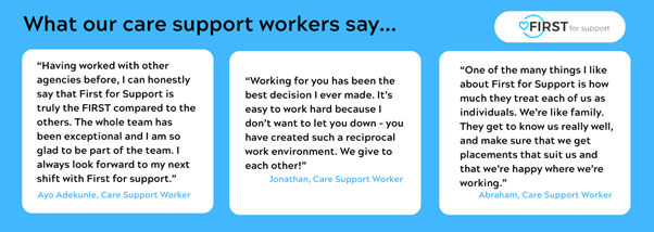 Watch this video to hear what one of our valued support workers has to say about working with First for Support.